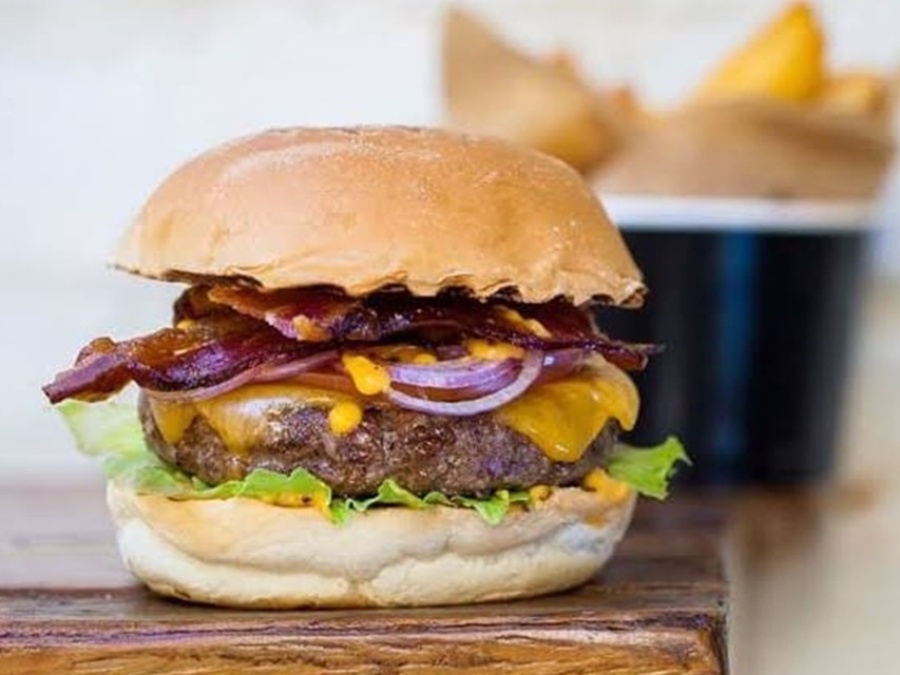 Pão, blend bovino 150g, bastante cheddar, farofa de bacon e molho da casaPorção de batata frita + 1 copo de salgadinhos