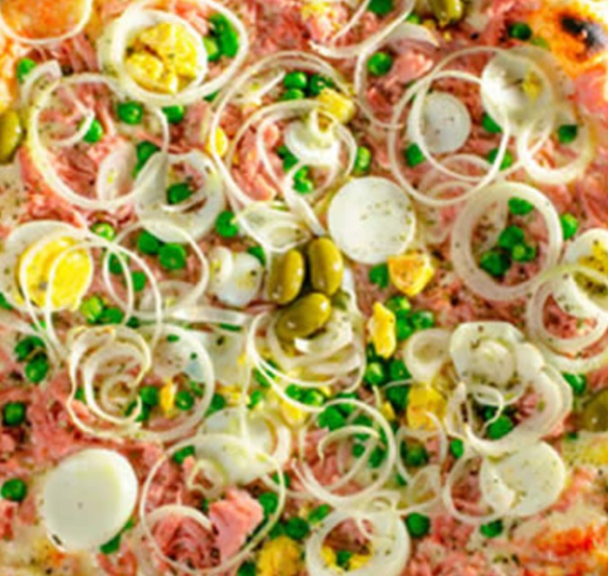 molho especial, muçarela, presunto, calabresa, tomate, cebola, pimentão, milho, ervilha, azeitona, ovo e orégano
