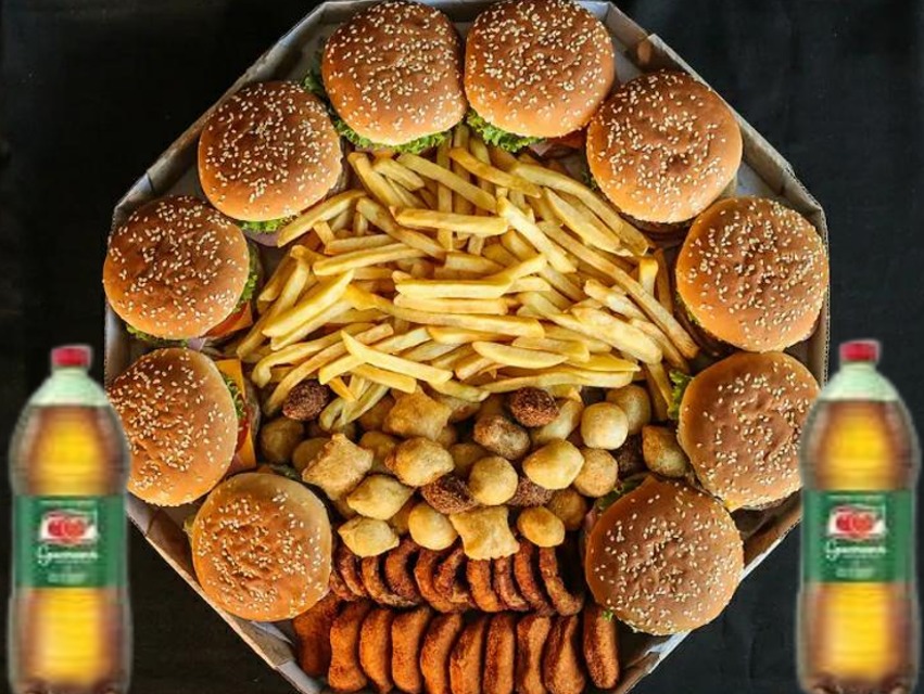 10 x-burguer + 900g de batata frita + 20 anéis de cebola + 50 salgadinhos sortidos + 2 refrigerantes de 2 litros